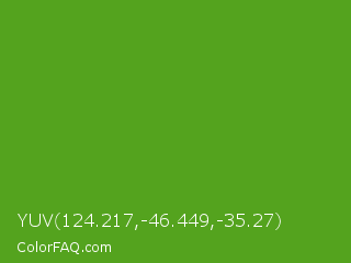 YUV 124.217,-46.449,-35.27 Color is a normal green color and the nearest color is Vida Loca #549019. Hex code #54a31e and RGB value is rgb(84,163,30). In RGB color space, this color is composed of 33% red, 64% green, 12% blue, In CMYK color space, this color is composed of 48% cyan, 0% magenta, 82% yellow , 36% black , In HSL color space, this color has a hue angle of 96° , 69% saturation and 38% lightness.