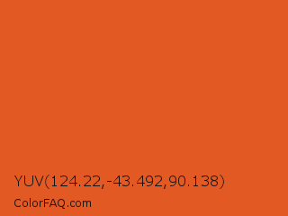 YUV 124.22,-43.492,90.138 Color is a normal orange color and the nearest color is Flame #e25822. Hex code #e35924 and RGB value is rgb(227,89,36). In RGB color space, this color is composed of 89% red, 35% green, 14% blue, In CMYK color space, this color is composed of 0% cyan, 61% magenta, 84% yellow , 11% black , In HSL color space, this color has a hue angle of 17° , 77% saturation and 52% lightness.