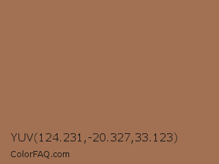 YUV 124.231,-20.327,33.123 Color is a normal orange color and the nearest color is Dirt #9b7653. Hex code #a27153 and RGB value is rgb(162,113,83). In RGB color space, this color is composed of 64% red, 44% green, 33% blue, In CMYK color space, this color is composed of 0% cyan, 30% magenta, 49% yellow , 36% black , In HSL color space, this color has a hue angle of 23° , 32% saturation and 48% lightness.