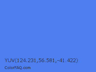 YUV 124.231,56.581,-41.422 Color is a light blue color and the nearest color is Blueberry #4f86f7. Hex code #4d7eef and RGB value is rgb(77,126,239). In RGB color space, this color is composed of 30% red, 49% green, 94% blue, In CMYK color space, this color is composed of 68% cyan, 47% magenta, 0% yellow , 6% black , In HSL color space, this color has a hue angle of 222° , 84% saturation and 62% lightness.
