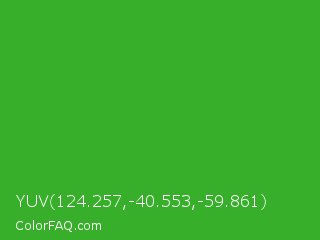 YUV 124.257,-40.553,-59.861 Color is a normal green color and the nearest color is Wageningen Green #34b233. Hex code #38af2a and RGB value is rgb(56,175,42). In RGB color space, this color is composed of 22% red, 69% green, 16% blue, In CMYK color space, this color is composed of 68% cyan, 0% magenta, 76% yellow , 31% black , In HSL color space, this color has a hue angle of 114° , 61% saturation and 43% lightness.
