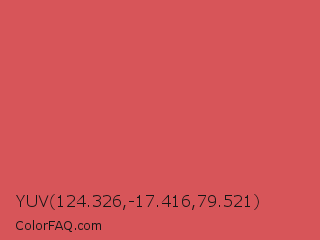 YUV 124.326,-17.416,79.521 Color is a normal red color and the nearest color is Chestnut Rose #cd5c5c. Hex code #d75559 and RGB value is rgb(215,85,89). In RGB color space, this color is composed of 84% red, 33% green, 35% blue, In CMYK color space, this color is composed of 0% cyan, 60% magenta, 59% yellow , 16% black , In HSL color space, this color has a hue angle of 358° , 62% saturation and 59% lightness.