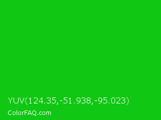 YUV 124.35,-51.938,-95.023 Color is a normal green color and the nearest color is Vivid Malachite #00cc33. Hex code #10c813 and RGB value is rgb(16,200,19). In RGB color space, this color is composed of 6% red, 78% green, 7% blue, In CMYK color space, this color is composed of 92% cyan, 0% magenta, 91% yellow , 22% black , In HSL color space, this color has a hue angle of 121° , 85% saturation and 42% lightness.