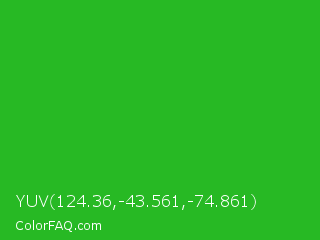 YUV 124.36,-43.561,-74.861 Color is a normal green color and the nearest color is Wageningen Green #34b233. Hex code #27b924 and RGB value is rgb(39,185,36). In RGB color space, this color is composed of 15% red, 73% green, 14% blue, In CMYK color space, this color is composed of 79% cyan, 0% magenta, 81% yellow , 27% black , In HSL color space, this color has a hue angle of 119° , 67% saturation and 43% lightness.