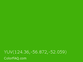 YUV 124.36,-56.872,-52.059 Color is a normal green color and the nearest color is Kelly Green #4cbb17. Hex code #41b109 and RGB value is rgb(65,177,9). In RGB color space, this color is composed of 25% red, 69% green, 4% blue, In CMYK color space, this color is composed of 63% cyan, 0% magenta, 95% yellow , 31% black , In HSL color space, this color has a hue angle of 100° , 90% saturation and 36% lightness.