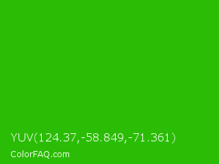 YUV 124.37,-58.849,-71.361 Color is a normal green color and the nearest color is Harlequin Green #46cb18. Hex code #2bbd05 and RGB value is rgb(43,189,5). In RGB color space, this color is composed of 17% red, 74% green, 2% blue, In CMYK color space, this color is composed of 77% cyan, 0% magenta, 97% yellow , 26% black , In HSL color space, this color has a hue angle of 108° , 95% saturation and 38% lightness.
