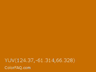 YUV 124.37,-61.314,66.328 Color is a normal orange color and the nearest color is Indochine #c26b03. Hex code #c86e00 and RGB value is rgb(200,110,-0). In RGB color space, this color is composed of 78% red, 43% green, 0% blue, In CMYK color space, this color is composed of 0% cyan, 45% magenta, 100% yellow , 22% black , In HSL color space, this color has a hue angle of 33° , 100% saturation and 39% lightness.