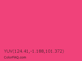 YUV 124.41,-1.188,101.372 Color is a normal rose color and the nearest color is Cerise Pink #ec3b83. Hex code #f0427a and RGB value is rgb(240,66,122). In RGB color space, this color is composed of 94% red, 26% green, 48% blue, In CMYK color space, this color is composed of 0% cyan, 73% magenta, 49% yellow , 6% black , In HSL color space, this color has a hue angle of 341° , 85% saturation and 60% lightness.