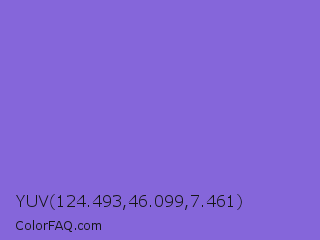 YUV 124.493,46.099,7.461 Color is a light indigo color and the nearest color is True V #8a73d6. Hex code #8566da and RGB value is rgb(133,102,218). In RGB color space, this color is composed of 52% red, 40% green, 85% blue, In CMYK color space, this color is composed of 39% cyan, 53% magenta, 0% yellow , 15% black , In HSL color space, this color has a hue angle of 256° , 61% saturation and 63% lightness.