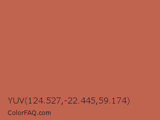 YUV 124.527,-22.445,59.174 Color is a normal red color and the nearest color is Cedar Chest #c95a49. Hex code #c0634f and RGB value is rgb(192,99,79). In RGB color space, this color is composed of 75% red, 39% green, 31% blue, In CMYK color space, this color is composed of 0% cyan, 48% magenta, 59% yellow , 25% black , In HSL color space, this color has a hue angle of 11° , 47% saturation and 53% lightness.