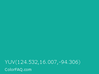 YUV 124.532,16.007,-94.306 Color is a normal cyan color and the nearest color is Light Sea Green #20b2aa. Hex code #11ad9d and RGB value is rgb(17,173,157). In RGB color space, this color is composed of 7% red, 68% green, 62% blue, In CMYK color space, this color is composed of 90% cyan, 0% magenta, 9% yellow , 32% black , In HSL color space, this color has a hue angle of 174° , 82% saturation and 37% lightness.
