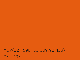 YUV 124.598,-53.539,92.438 Color is a normal orange color and the nearest color is Spanish Orange #e86100. Hex code #e65c10 and RGB value is rgb(230,92,16). In RGB color space, this color is composed of 90% red, 36% green, 6% blue, In CMYK color space, this color is composed of 0% cyan, 60% magenta, 93% yellow , 10% black , In HSL color space, this color has a hue angle of 21° , 87% saturation and 48% lightness.