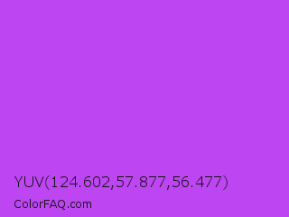 YUV 124.602,57.877,56.477 Color is a light purple color and the nearest color is Medium Orchid #ba55d3. Hex code #bd45f2 and RGB value is rgb(189,69,242). In RGB color space, this color is composed of 74% red, 27% green, 95% blue, In CMYK color space, this color is composed of 22% cyan, 71% magenta, 0% yellow , 5% black , In HSL color space, this color has a hue angle of 282° , 87% saturation and 61% lightness.