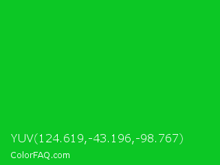 YUV 124.619,-43.196,-98.767 Color is a normal green color and the nearest color is Vivid Malachite #00cc33. Hex code #0cc725 and RGB value is rgb(12,199,37). In RGB color space, this color is composed of 5% red, 78% green, 15% blue, In CMYK color space, this color is composed of 94% cyan, 0% magenta, 81% yellow , 22% black , In HSL color space, this color has a hue angle of 128° , 89% saturation and 41% lightness.
