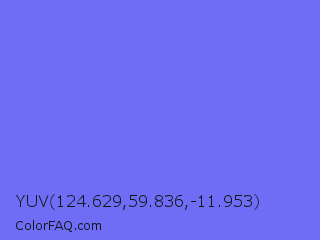 YUV 124.629,59.836,-11.953 Color is a light indigo color and the nearest color is Very Light Blue #6666ff. Hex code #6f6cf6 and RGB value is rgb(111,108,246). In RGB color space, this color is composed of 44% red, 42% green, 96% blue, In CMYK color space, this color is composed of 55% cyan, 56% magenta, 0% yellow , 4% black , In HSL color space, this color has a hue angle of 241° , 88% saturation and 69% lightness.