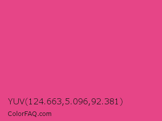 YUV 124.663,5.096,92.381 Color is a normal rose color and the nearest color is Cerise Pink #ec3b83. Hex code #e64587 and RGB value is rgb(230,69,135). In RGB color space, this color is composed of 90% red, 27% green, 53% blue, In CMYK color space, this color is composed of 0% cyan, 70% magenta, 41% yellow , 10% black , In HSL color space, this color has a hue angle of 335° , 76% saturation and 59% lightness.