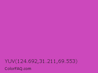YUV 124.692,31.211,69.553 Color is a normal magenta color and the nearest color is Fuchsia Pink #c154c1. Hex code #cc48bc and RGB value is rgb(204,72,188). In RGB color space, this color is composed of 80% red, 28% green, 74% blue, In CMYK color space, this color is composed of 0% cyan, 65% magenta, 8% yellow , 20% black , In HSL color space, this color has a hue angle of 307° , 56% saturation and 54% lightness.