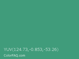 YUV 124.73,-0.853,-53.26 Color is a normal green color and the nearest color is Ocean Green #41aa78. Hex code #409c7b and RGB value is rgb(64,156,123). In RGB color space, this color is composed of 25% red, 61% green, 48% blue, In CMYK color space, this color is composed of 59% cyan, 0% magenta, 21% yellow , 39% black , In HSL color space, this color has a hue angle of 158° , 42% saturation and 43% lightness.