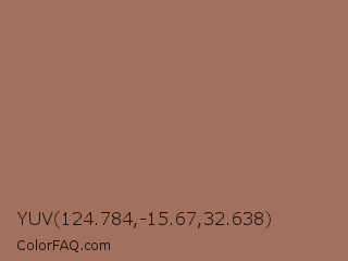 YUV 124.784,-15.67,32.638 Color is a normal orange color and the nearest color is Blast Off Bronze #a57164. Hex code #a2705d and RGB value is rgb(162,112,93). In RGB color space, this color is composed of 64% red, 44% green, 36% blue, In CMYK color space, this color is composed of 0% cyan, 31% magenta, 43% yellow , 36% black , In HSL color space, this color has a hue angle of 17° , 27% saturation and 50% lightness.