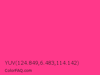 YUV 124.849,6.483,114.142 Color is a light rose color and the nearest color is French Fuchsia #fd3f92. Hex code #ff388a and RGB value is rgb(255,56,138). In RGB color space, this color is composed of 100% red, 22% green, 54% blue, In CMYK color space, this color is composed of 0% cyan, 78% magenta, 46% yellow , 0% black , In HSL color space, this color has a hue angle of 335° , 100% saturation and 61% lightness.