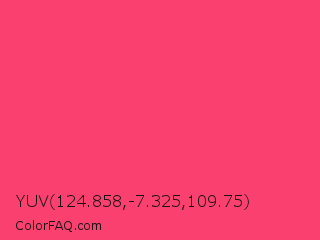 YUV 124.858,-7.325,109.75 Color is a light red color and the nearest color is Magic Potion #ff4466. Hex code #fa406e and RGB value is rgb(250,64,110). In RGB color space, this color is composed of 98% red, 25% green, 43% blue, In CMYK color space, this color is composed of 0% cyan, 74% magenta, 56% yellow , 2% black , In HSL color space, this color has a hue angle of 345° , 95% saturation and 62% lightness.