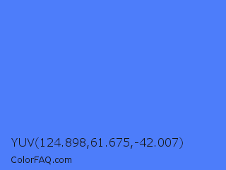 YUV 124.898,61.675,-42.007 Color is a light blue color and the nearest color is Blueberry #4f86f7. Hex code #4d7dfa and RGB value is rgb(77,125,250). In RGB color space, this color is composed of 30% red, 49% green, 98% blue, In CMYK color space, this color is composed of 69% cyan, 50% magenta, 0% yellow , 2% black , In HSL color space, this color has a hue angle of 223° , 95% saturation and 64% lightness.