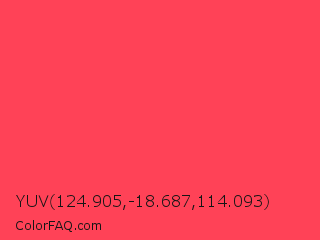 YUV 124.905,-18.687,114.093 Color is a light red color and the nearest color is Sizzling Red #ff3855. Hex code #ff4257 and RGB value is rgb(255,66,87). In RGB color space, this color is composed of 100% red, 26% green, 34% blue, In CMYK color space, this color is composed of 0% cyan, 74% magenta, 66% yellow , 0% black , In HSL color space, this color has a hue angle of 353° , 100% saturation and 63% lightness.