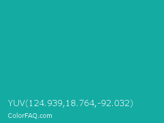 YUV 124.939,18.764,-92.032 Color is a normal cyan color and the nearest color is Light Sea Green #20b2aa. Hex code #14aba3 and RGB value is rgb(20,171,163). In RGB color space, this color is composed of 8% red, 67% green, 64% blue, In CMYK color space, this color is composed of 88% cyan, 0% magenta, 5% yellow , 33% black , In HSL color space, this color has a hue angle of 177° , 79% saturation and 37% lightness.