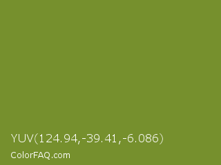 YUV 124.94,-39.41,-6.086 Color is a normal lime color and the nearest color is Wasabi #788a25. Hex code #76902d and RGB value is rgb(118,144,45). In RGB color space, this color is composed of 46% red, 56% green, 18% blue, In CMYK color space, this color is composed of 18% cyan, 0% magenta, 69% yellow , 44% black , In HSL color space, this color has a hue angle of 76° , 52% saturation and 37% lightness.