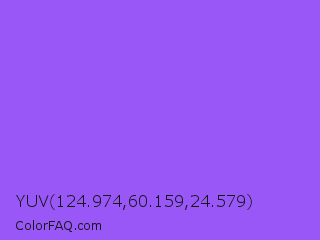 YUV 124.974,60.159,24.579 Color is a light violet color and the nearest color is Navy Purple #9457eb. Hex code #9957f7 and RGB value is rgb(153,87,247). In RGB color space, this color is composed of 60% red, 34% green, 97% blue, In CMYK color space, this color is composed of 38% cyan, 65% magenta, 0% yellow , 3% black , In HSL color space, this color has a hue angle of 265° , 91% saturation and 65% lightness.
