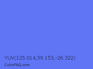 YUV 125.014,59.153,-26.322 Color is a light blue color and the nearest color is Very Light Blue #6666ff. Hex code #5f75f5 and RGB value is rgb(95,117,245). In RGB color space, this color is composed of 37% red, 46% green, 96% blue, In CMYK color space, this color is composed of 61% cyan, 52% magenta, 0% yellow , 4% black , In HSL color space, this color has a hue angle of 231° , 88% saturation and 67% lightness.