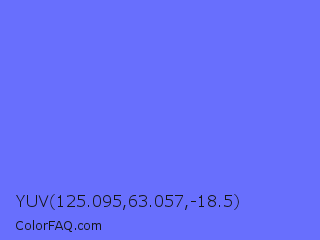 YUV 125.095,63.057,-18.5 Color is a light blue color and the nearest color is Very Light Blue #6666ff. Hex code #686ffd and RGB value is rgb(104,111,253). In RGB color space, this color is composed of 41% red, 44% green, 99% blue, In CMYK color space, this color is composed of 59% cyan, 56% magenta, 0% yellow , 1% black , In HSL color space, this color has a hue angle of 237° , 97% saturation and 70% lightness.