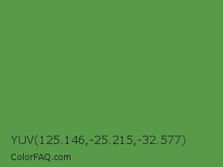 YUV 125.146,-25.215,-32.577 Color is a normal green color and the nearest color is May Green #4c9141. Hex code #589a4a and RGB value is rgb(88,154,74). In RGB color space, this color is composed of 35% red, 60% green, 29% blue, In CMYK color space, this color is composed of 43% cyan, 0% magenta, 52% yellow , 40% black , In HSL color space, this color has a hue angle of 110° , 35% saturation and 45% lightness.