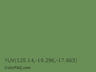 YUV 125.14,-19.296,-17.663 Color is a normal green color and the nearest color is Highland #6f8e63. Hex code #698f56 and RGB value is rgb(105,143,86). In RGB color space, this color is composed of 41% red, 56% green, 34% blue, In CMYK color space, this color is composed of 27% cyan, 0% magenta, 40% yellow , 44% black , In HSL color space, this color has a hue angle of 100° , 25% saturation and 45% lightness.