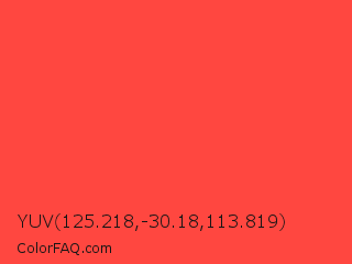 YUV 125.218,-30.18,113.819 Color is a light red color and the nearest color is Sunset Orange #fe4c40. Hex code #ff4740 and RGB value is rgb(255,71,64). In RGB color space, this color is composed of 100% red, 28% green, 25% blue, In CMYK color space, this color is composed of 0% cyan, 72% magenta, 75% yellow , 0% black , In HSL color space, this color has a hue angle of 2° , 100% saturation and 63% lightness.