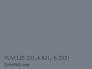 YUV 125.221,4.821,-6.333 Color is a normal blue color and the nearest color is Rolling Stone #747d83. Hex code #767f87 and RGB value is rgb(118,127,135). In RGB color space, this color is composed of 46% red, 50% green, 53% blue, In CMYK color space, this color is composed of 13% cyan, 6% magenta, 0% yellow , 47% black , In HSL color space, this color has a hue angle of 208° , 7% saturation and 50% lightness.