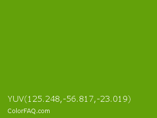 YUV 125.248,-56.817,-23.019 Color is a normal green color and the nearest color is Christi #67a712. Hex code #63a10a and RGB value is rgb(99,161,10). In RGB color space, this color is composed of 39% red, 63% green, 4% blue, In CMYK color space, this color is composed of 39% cyan, 0% magenta, 94% yellow , 37% black , In HSL color space, this color has a hue angle of 85° , 88% saturation and 34% lightness.