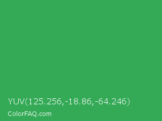 YUV 125.256,-18.86,-64.246 Color is a normal green color and the nearest color is Chateau Green #40a860. Hex code #34aa57 and RGB value is rgb(52,170,87). In RGB color space, this color is composed of 20% red, 67% green, 34% blue, In CMYK color space, this color is composed of 69% cyan, 0% magenta, 49% yellow , 33% black , In HSL color space, this color has a hue angle of 138° , 53% saturation and 44% lightness.
