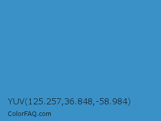 YUV 125.257,36.848,-58.984 Color is a normal blue color and the nearest color is Celestial Blue #4997d0. Hex code #3a91c8 and RGB value is rgb(58,145,200). In RGB color space, this color is composed of 23% red, 57% green, 78% blue, In CMYK color space, this color is composed of 71% cyan, 28% magenta, 0% yellow , 22% black , In HSL color space, this color has a hue angle of 203° , 56% saturation and 51% lightness.