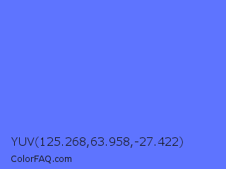 YUV 125.268,63.958,-27.422 Color is a light blue color and the nearest color is Very Light Blue #6666ff. Hex code #5e74ff and RGB value is rgb(94,116,255). In RGB color space, this color is composed of 37% red, 45% green, 100% blue, In CMYK color space, this color is composed of 63% cyan, 55% magenta, 0% yellow , 0% black , In HSL color space, this color has a hue angle of 232° , 100% saturation and 68% lightness.