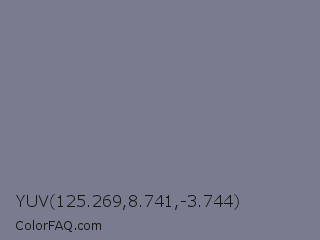 YUV 125.269,8.741,-3.744 Color is a normal blue color and the nearest color is Waterloo #7b7c94. Hex code #797c8f and RGB value is rgb(121,124,143). In RGB color space, this color is composed of 47% red, 49% green, 56% blue, In CMYK color space, this color is composed of 15% cyan, 13% magenta, 0% yellow , 44% black , In HSL color space, this color has a hue angle of 232° , 9% saturation and 52% lightness.