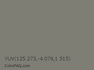 YUV 125.273,-4.079,1.515 Color is a normal yellow color and the nearest color is Friar Gray #807e79. Hex code #7f7e75 and RGB value is rgb(127,126,117). In RGB color space, this color is composed of 50% red, 49% green, 46% blue, In CMYK color space, this color is composed of 0% cyan, 1% magenta, 8% yellow , 50% black , In HSL color space, this color has a hue angle of 54° , 4% saturation and 48% lightness.