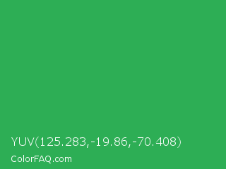 YUV 125.283,-19.86,-70.408 Color is a normal green color and the nearest color is Chateau Green #40a860. Hex code #2dae55 and RGB value is rgb(45,174,85). In RGB color space, this color is composed of 18% red, 68% green, 33% blue, In CMYK color space, this color is composed of 74% cyan, 0% magenta, 51% yellow , 32% black , In HSL color space, this color has a hue angle of 139° , 59% saturation and 43% lightness.