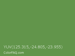 YUV 125.315,-24.805,-23.955 Color is a normal green color and the nearest color is Palm Leaf #6f9940. Hex code #62954b and RGB value is rgb(98,149,75). In RGB color space, this color is composed of 38% red, 58% green, 29% blue, In CMYK color space, this color is composed of 34% cyan, 0% magenta, 50% yellow , 42% black , In HSL color space, this color has a hue angle of 101° , 33% saturation and 44% lightness.