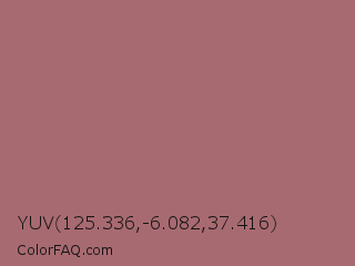 YUV 125.336,-6.082,37.416 Color is a normal red color and the nearest color is Coral Tree #a86b6b. Hex code #a86a71 and RGB value is rgb(168,106,113). In RGB color space, this color is composed of 66% red, 42% green, 44% blue, In CMYK color space, this color is composed of 0% cyan, 37% magenta, 33% yellow , 34% black , In HSL color space, this color has a hue angle of 353° , 26% saturation and 54% lightness.