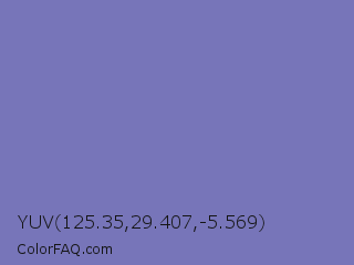 YUV 125.35,29.407,-5.569 Color is a normal indigo color and the nearest color is Toolbox #746cc0. Hex code #7775b9 and RGB value is rgb(119,117,185). In RGB color space, this color is composed of 47% red, 46% green, 73% blue, In CMYK color space, this color is composed of 36% cyan, 37% magenta, 0% yellow , 27% black , In HSL color space, this color has a hue angle of 242° , 33% saturation and 59% lightness.