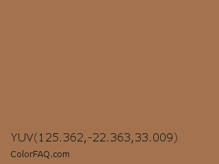 YUV 125.362,-22.363,33.009 Color is a normal orange color and the nearest color is Dirt #9b7653. Hex code #a37350 and RGB value is rgb(163,115,80). In RGB color space, this color is composed of 64% red, 45% green, 31% blue, In CMYK color space, this color is composed of 0% cyan, 29% magenta, 51% yellow , 36% black , In HSL color space, this color has a hue angle of 25° , 34% saturation and 48% lightness.