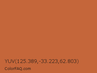 YUV 125.389,-33.223,62.803 Color is a normal orange color and the nearest color is Tuscany #bd5e2e. Hex code #c5663a and RGB value is rgb(197,102,58). In RGB color space, this color is composed of 77% red, 40% green, 23% blue, In CMYK color space, this color is composed of 0% cyan, 48% magenta, 71% yellow , 23% black , In HSL color space, this color has a hue angle of 19° , 55% saturation and 50% lightness.