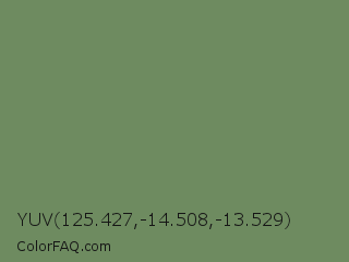 YUV 125.427,-14.508,-13.529 Color is a normal green color and the nearest color is Highland #6f8e63. Hex code #6e8b60 and RGB value is rgb(110,139,96). In RGB color space, this color is composed of 43% red, 55% green, 38% blue, In CMYK color space, this color is composed of 21% cyan, 0% magenta, 31% yellow , 45% black , In HSL color space, this color has a hue angle of 100° , 18% saturation and 46% lightness.