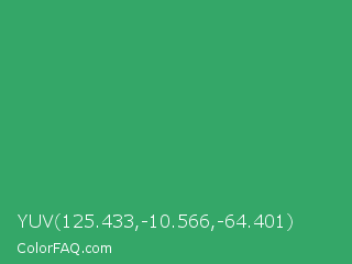 YUV 125.433,-10.566,-64.401 Color is a normal green color and the nearest color is Chateau Green #40a860. Hex code #34a768 and RGB value is rgb(52,167,104). In RGB color space, this color is composed of 20% red, 65% green, 41% blue, In CMYK color space, this color is composed of 69% cyan, 0% magenta, 38% yellow , 35% black , In HSL color space, this color has a hue angle of 147° , 53% saturation and 43% lightness.